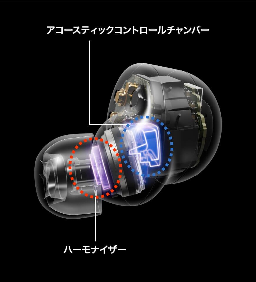 内向きマイクが耳の形状や装着状態を測定し、H2チップを使って低周波から高周波までリアルタイムでチューニングします。これにより、細部まで一貫した音質を維持します。