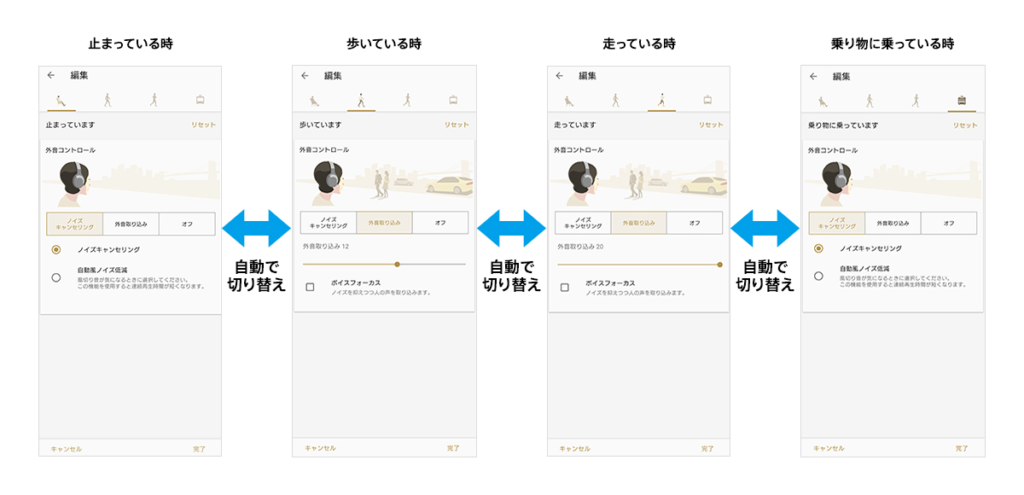 一方、WF-1000XM5は、行動や場所に基づいてモードを切り替える方式です。スマートフォンのセンサーやGPSを使い、歩行・乗り物・滞在場所などを検知します。専用アプリで設定することで、シーンごとに最適なノイズ制御へ自動切替します。さらに、場所別の設定を学習し、固定環境での安定した使い分けに対応します。