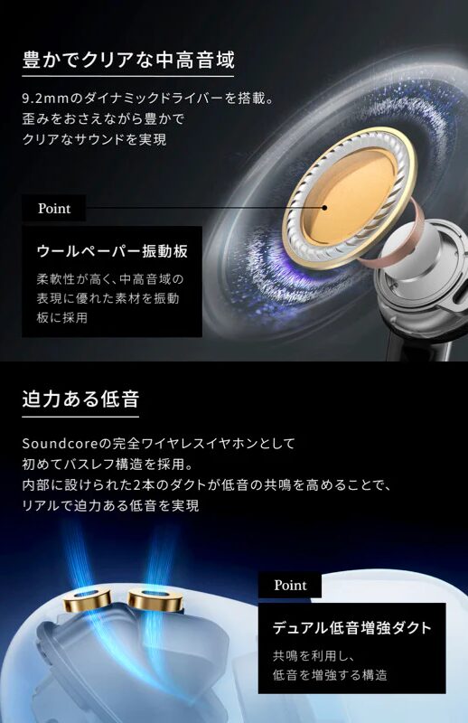 Liberty 5は、9.2mmのダイナミックドライバーを搭載し、歪みを抑えながら中高音域をクリアに再生します。さらに、Soundcore完全ワイヤレスとして初めてバスレフ構造を採用し、2本の低音増強ダクトにより迫力ある低音を実現しています。