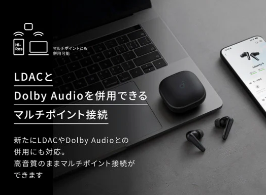 Soundcore Liberty5は、2台の端末に同時接続可能です。LDACやDolby Audioなどの高音質コーデックも併用できるため、高音質を維持したままマルチポイント接続を利用できます。設定はデフォルトで有効になっており、Soundcoreアプリやイヤホンの感圧操作で手動ペアリングも可能です。